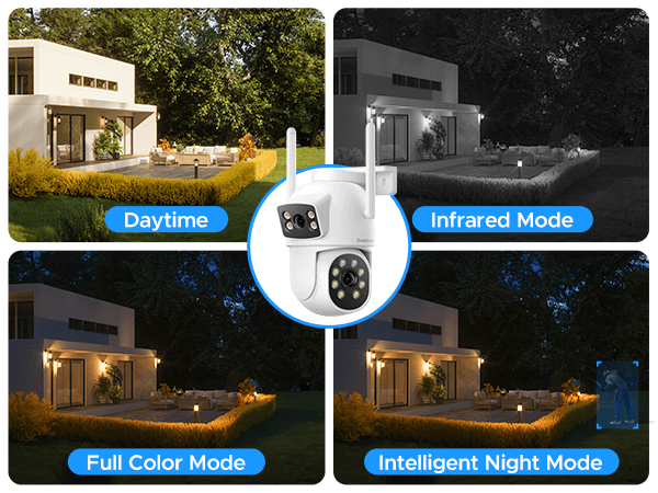 adopts an advanced CMOS image sensor, 4 mm +4 mm lens, 4 Infrared LEDs, and 4 white lights, which can provide 2 MP +2 MP HD Full-color images and videos in dark night