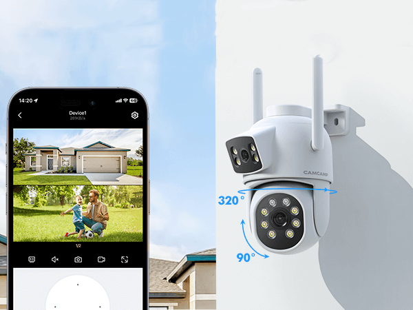 Camcamp SC49 security camera System has two lenses: one 110° wide-angle fixed lens (adjust the angle by hand) to monitor the key area, the other Pan 355° & Tilt 90° dome lens (rotate on your phone) covers all-round without blind spots.