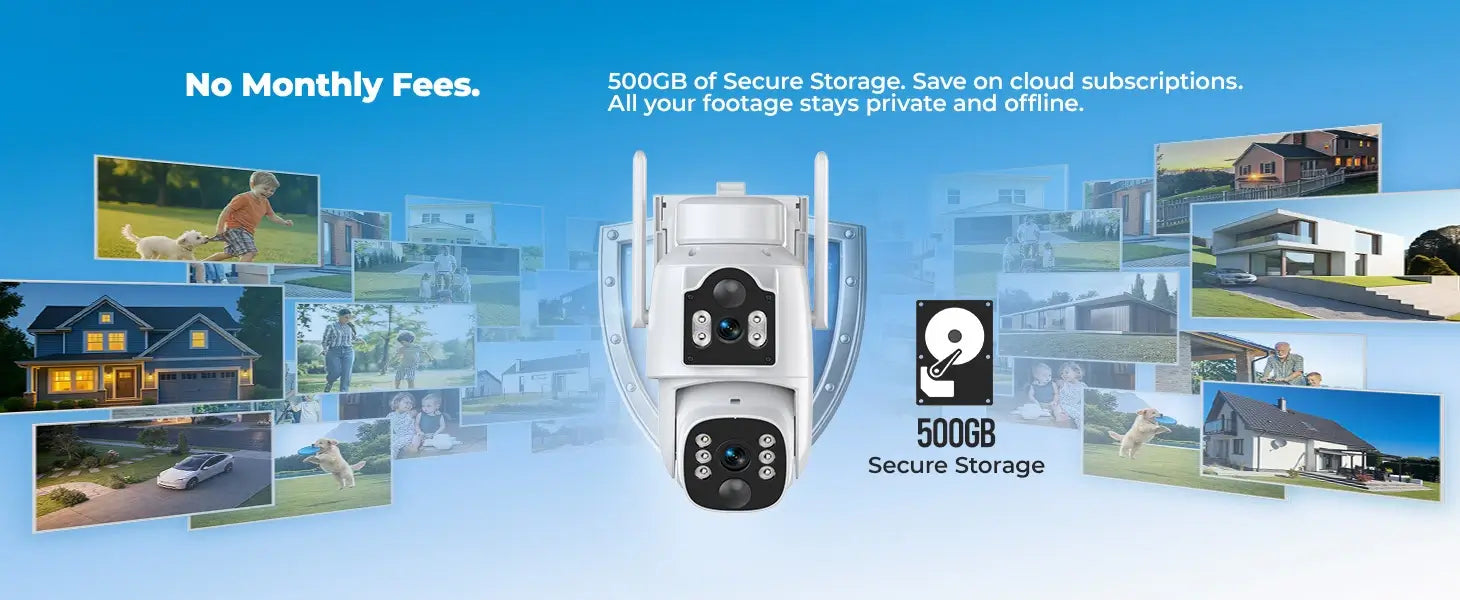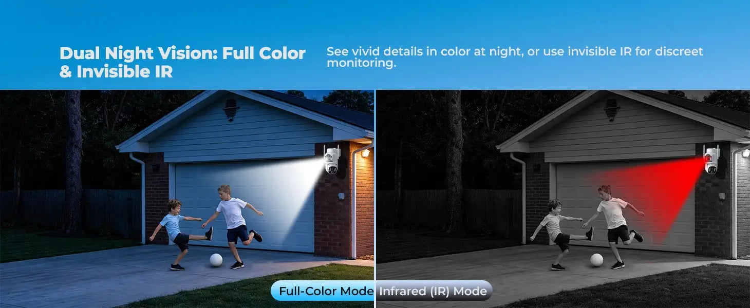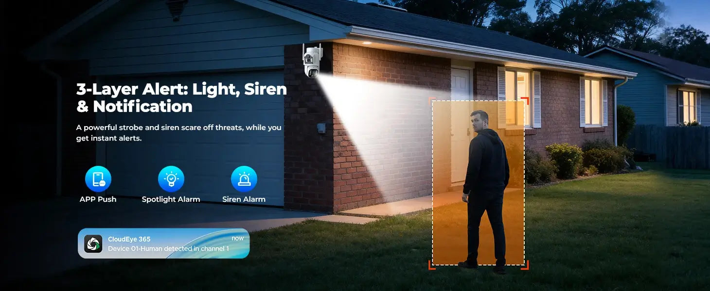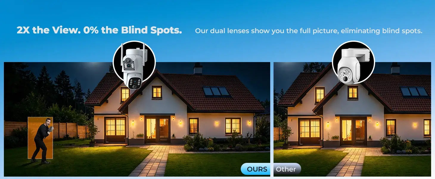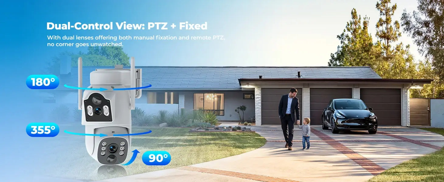 See your whole property clearly—no blind spots. This solar camera pairs a fixed top lens with a bottom lens you can pan and tilt remotely from your phone. Four cameras work together to give you dual-screen views。