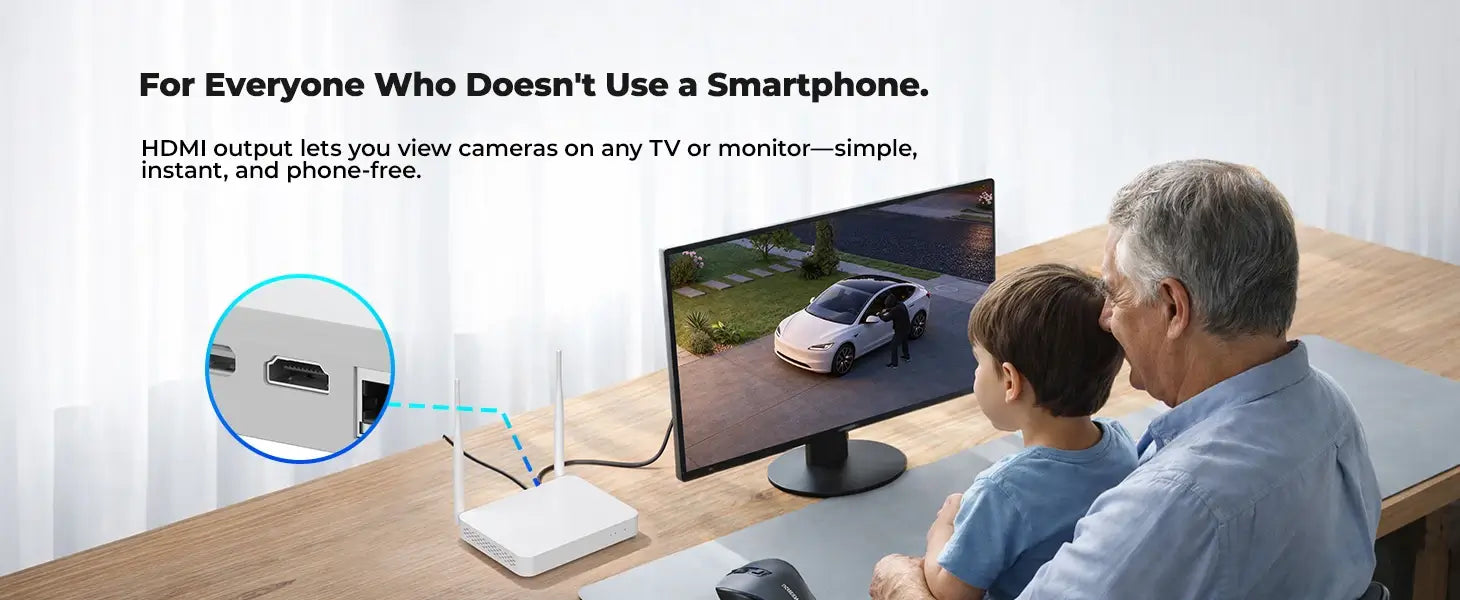 supports stable, interference-free video transmission. Extra HDMI port allows instant TV viewing—suitable for businesses or seniors who prefer not using smartphones. No monthly fees, straightforward setup.