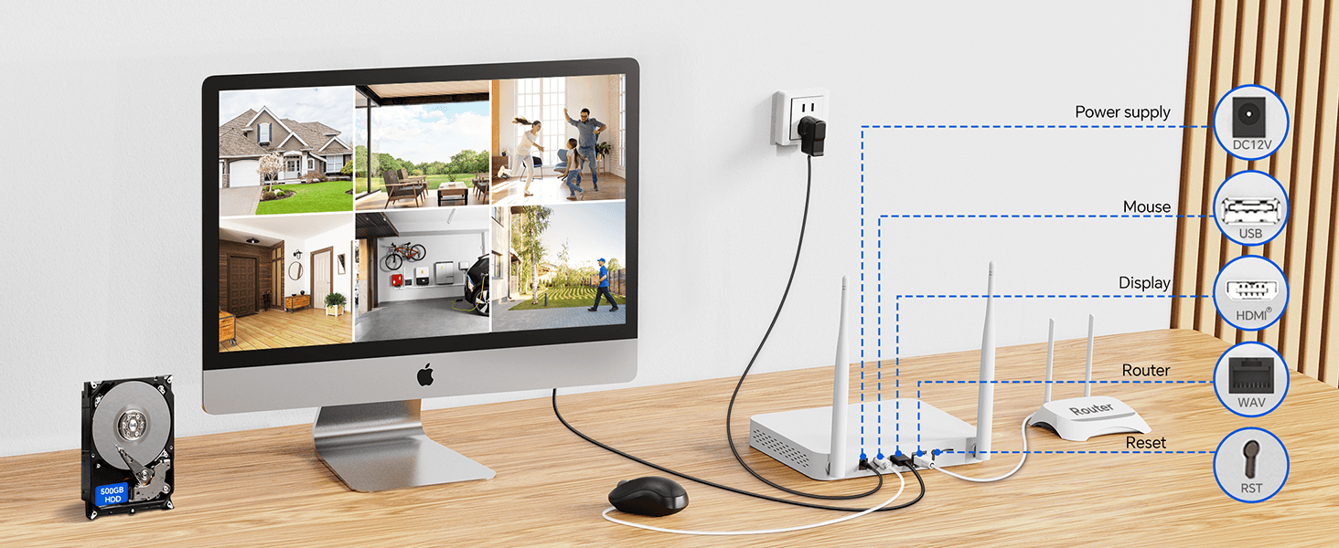 Equipped with a pre-installed 500GB hard drive to store more videos. Supports connecting up to 10 cameras. There are no monthly fees or hidden fees, and it supports connecting to Alexa devices.