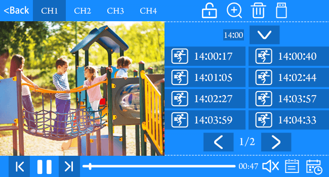 Support playback by time or by date, or by motion videos of each security camera channel captured, fast and easy to find the footage you want on the 7" Touchscreen monitor.