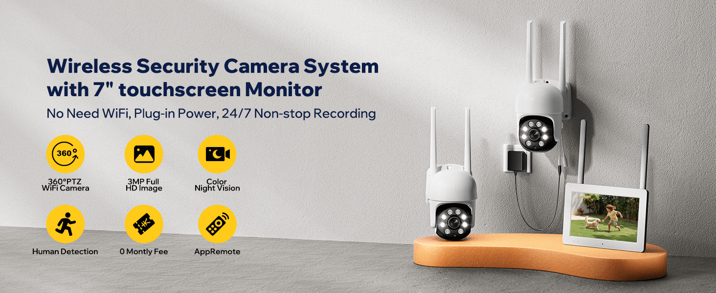 The wireless security camera systemworks without the internet required, just power the wireless ptz security camera and the touchscreen NVR monitor, and turn them on, both will sync automatically in a minute and work. (The cameras need to plug into the power supply always)