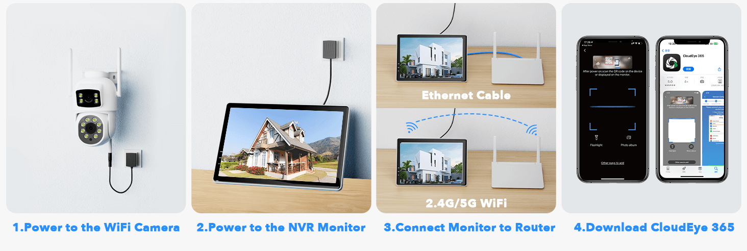 - 4x Wired WiFi Outdoor PTZ Cameras (with DC12V/1A Power Supply)