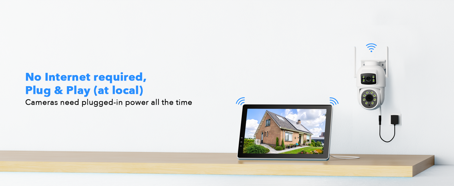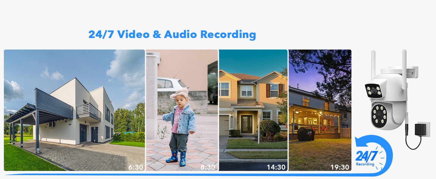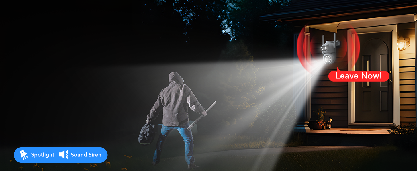Built-in smart AI motion detection to identify people, pets, and vehicles for accuracy. After being triggered by human movement, the camera will automatically track and capture footage and push real-time alerts on your phone/Email. You can also set the camera to sound an alarm or flash a white light to drive off the suspicious around your house.