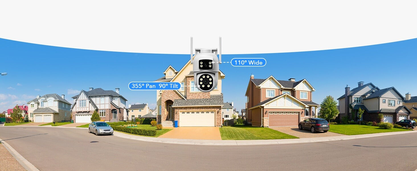 Camcamp SC49 security camera System has two lenses: one 110° wide-angle fixed lens (adjust the angle by hand) to monitor the key area, the other Pan 355° & Tilt 90° dome lens (rotate on your phone) covers all-round without blind spots.