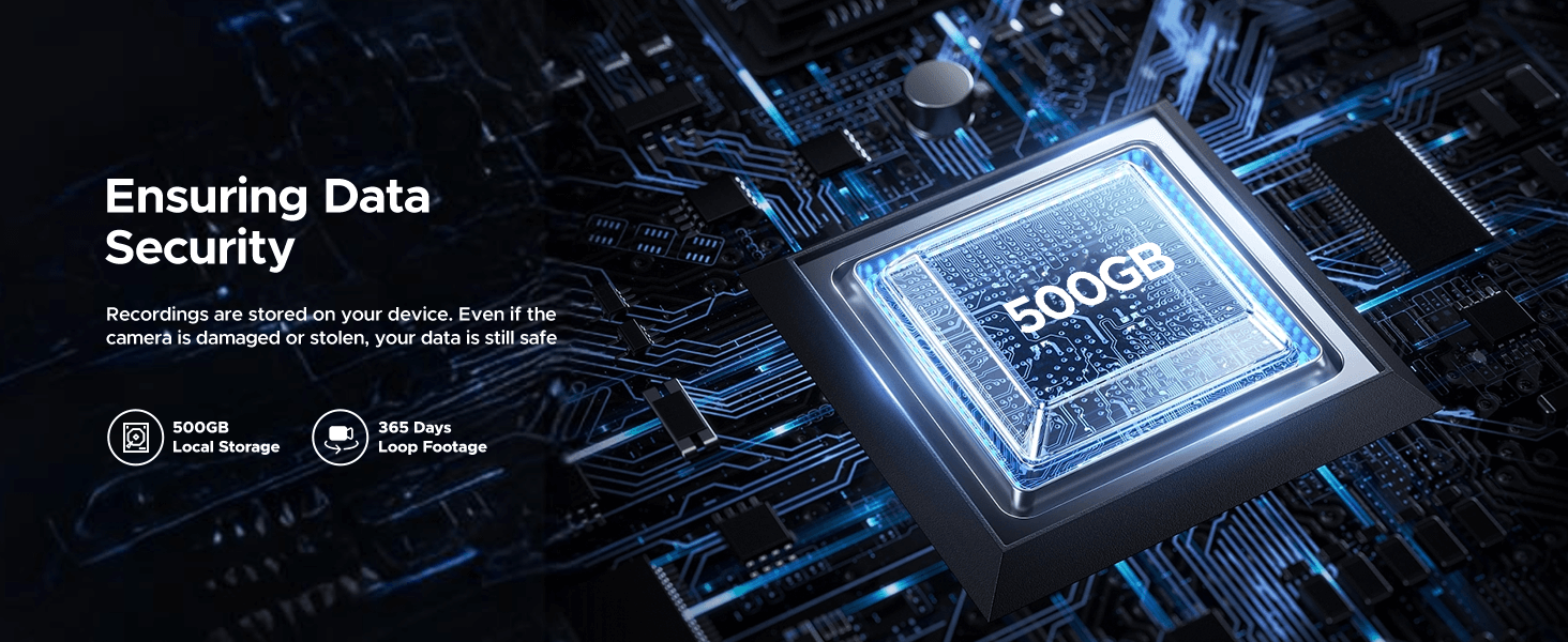 With our 500GB HDD, you can store video footage for an extended period (supports up to 6TB HDD) of up to 90 days. All video data is encrypted and stored locally, eliminating the need for monthly fees
