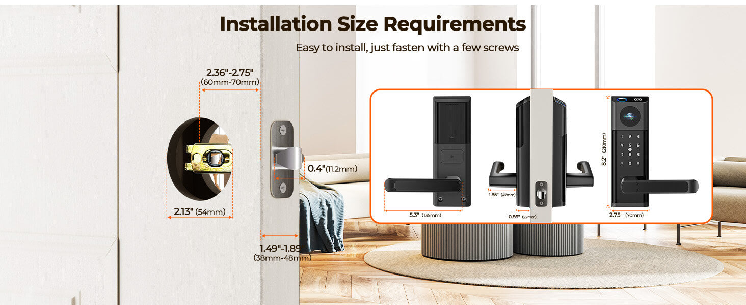 Upgrade your door in minutes! Designed for DIYers and renters, this smart lock for front door setups requires no drilling or wiring—just match your door’s specs. Adjustable components ensure a perfect fit. Security made simple!