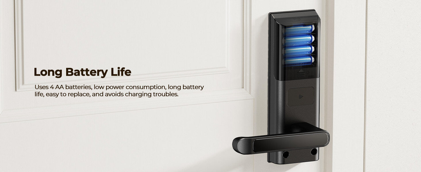 - Powered by 4 AA batteries, this smart locks is energy-efficient and provides low-voltage alerts. In a pinch, use a power bank to keep it running.